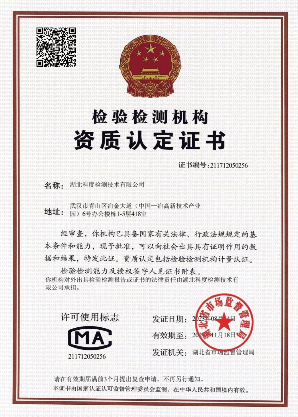 湖北科度檢測技術(shù)有限公司是一家專業(yè)從事環(huán)境類及相關(guān)領(lǐng)域檢測的第三方檢測機構(gòu),公司已通過湖北省市場監(jiān)督管理局CMA計量認證,可以面向社會出具權(quán)威CMA檢測報告。 我公司實驗室嚴格按照國家標準建設,擁有一大批國內(nèi)外先進儀器設備及現(xiàn)代化配套設施,并有經(jīng)驗豐富的中高級專業(yè)技術(shù)人員和嚴格的實驗室質(zhì)量保證體系為項目運作提供強力支撐。 作為第三方檢測機構(gòu),公司始終以高度的社會責任感經(jīng)營企業(yè),以“公正、嚴謹、高效”為宗旨,依托專業(yè)的技術(shù)實力為客戶提供專業(yè)優(yōu)質(zhì)檢測服務,受到政府、企業(yè)和社會各界的廣泛關(guān)注和認可。
